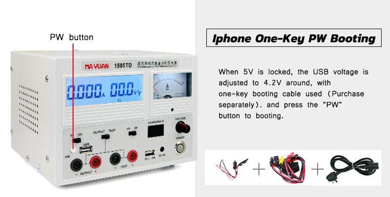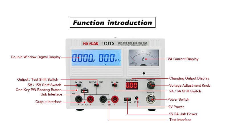 - دقة عرض 4 خانات: يوفر باور سبلاي 1505TD قراءة لشدة التيار تصل إلى 1 مللي أمبير، وهي ميزة أساسية لكشف التسريبات البسيطة على البوردة، تماشياً مع توصيات iFixit لتشخيص أعطال البور.